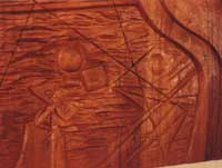 "As I drew the life-size pattern, more ideas came in--of round shapes--smooth in the midst of chaos-sort of cosmic, skies, etc. Fortunately, I bought 2" deep planks which allowed me later to carve much deeper. The wood was cut and glued by Jim Ipekjian of Pasadena, a fine wood worker. Each section weighed between 80-100 pounds--a total of 1,200 pounds of Honduras mahogany-of which one half was carved out.