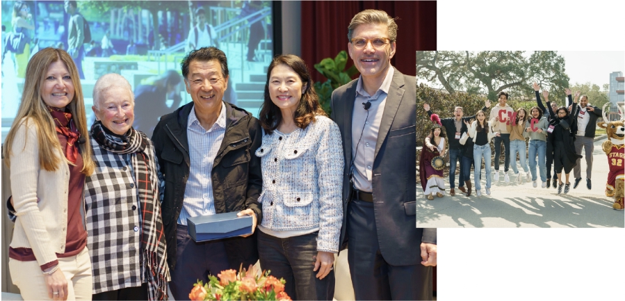 More than 900 family members and friends flocked to campus to experience CMC through the eyes of their students—enjoying the opportunity to see faculty in action, hear President Hiram Chodosh review the College’s achievements and aspirations, and discover the programs that distinguish CMC. President Chodosh presented the annual Jil Stark ’58 GP’11 Parent Volunteer Award to Robin and Bobby Lee P’24, (middle) with Stark providing the introduction. The award recognizes and honors CMC parents who have contributed in a meaningful way to the mission of the College. In addition, Allison Aldrich P’24, (left) president of the CMC Parent Network Board, interviewed President Chodosh during the Q&A portion of the program.