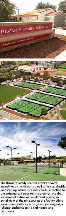 The Biszantz Family Tennis Center at CMC has received an Excellence in Design Award from the Claremont Architectural Commission, in the category of New Construction and Sustainable Landscaping.
