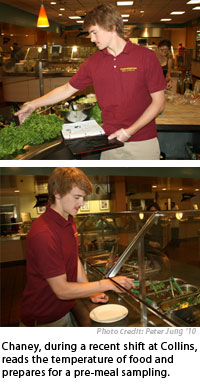 Chaney is the first student to serve in this brand-new role, which requires him to arrive at Collins prior to the start of a meal period for a tasting of that mealtime's offerings. He's also there to help answer any questions and to elicit suggestions from student, faculty, and staff, which he then shares with the Collins team at the end of each week.
