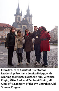 Four CMC students represented the Kravis Leadership Institute and the College last week in the Student Case Competition at the International Leadership Association's annual global conference. The conference, held in Prague, Czech Republic, Nov. 11-14, brought together more than 650 leadership scholars, students, and practitioners from across the globe to discuss and explore various leadership concepts. This is the third year the conference has included a student case competitionpart of an effort to engage student participants, and offer a more interactive experience for these younger attendees.