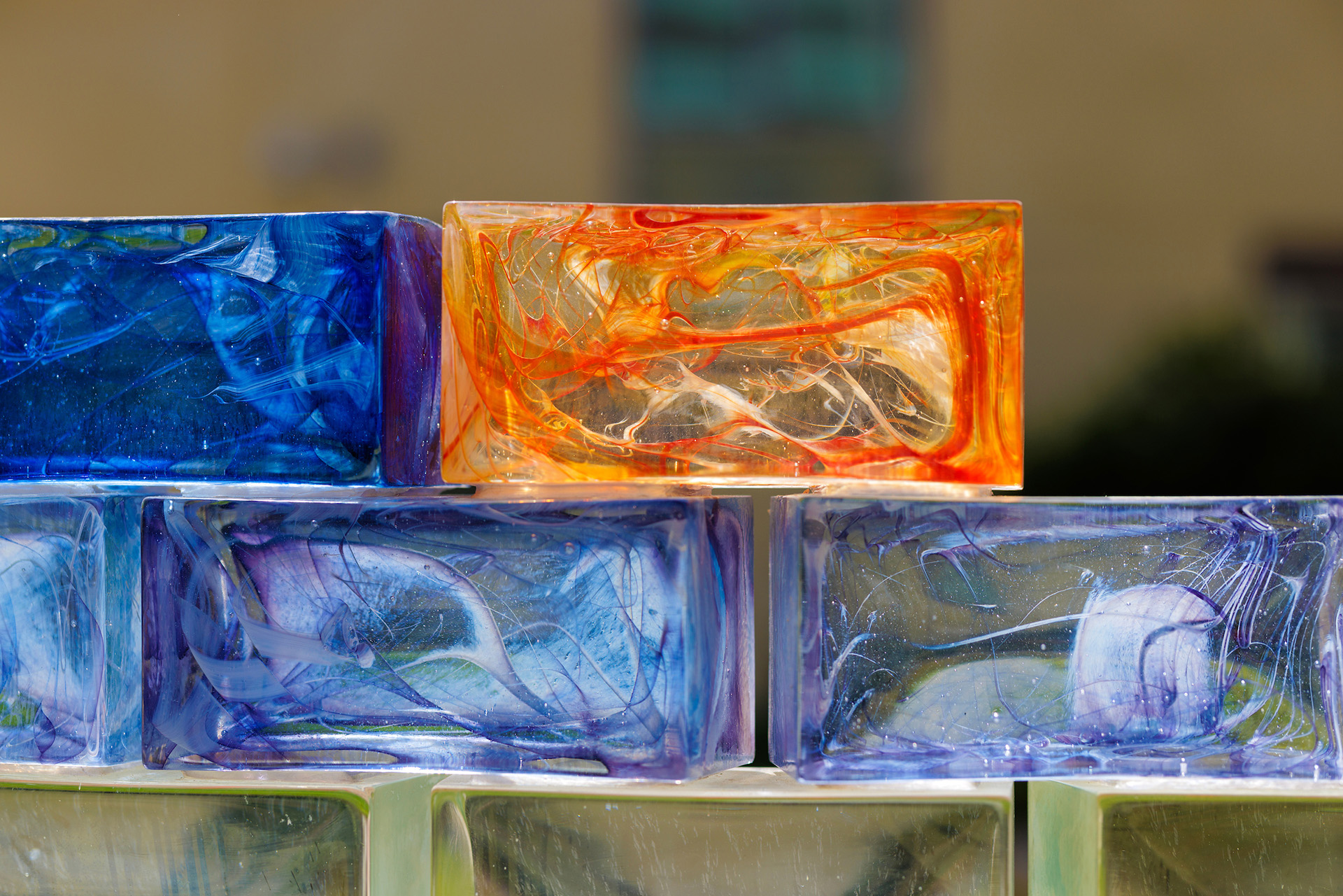 Comprised of more than 1,500 glass bricks, each weighing nearly 40 pounds and hand-forged by Italian artisans in a palette of 26 colors, Qwalala is derived from the Pomo tribal word describing the meandering path of the Gualala River on the northern coast of California. Like the river itself, Qwalala will change visually throughout the day as light and shadows cast upon clear and colored glass bricks, creating a “storm”-like effect of swirling color, while remaining transparent.